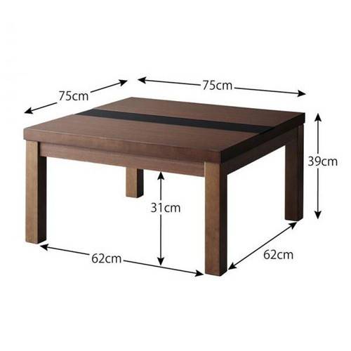 アーバンモダンデザインこたつテーブル◆正方形(75×75)【サイズ】幅75×奥行75×高さ39cm【商品重量】17kg【梱包サイズ・梱包重量】90×81×16cm/18kg◆長方形(90×60)【サイズ】幅90×奥行60×高さ39cm【商品重量】17kg【梱包サイズ・梱包重量】109×67×16cm/18kg◆長方形(105×75)【サイズ】幅105×奥行75×高さ39cm【商品重量】22kg【梱包サイズ・梱包重量】120×82×16cm/23kg◆長方形(120×80)【サイズ】幅120×奥行80×高さ39cm【商品重量】24.5kg【梱包サイズ・梱包重量】128×87×16cm/25.5kg◆長方形(150×80)【サイズ】幅150×奥行80×高さ39cm【商品重量】38kg【梱包サイズ・梱包重量】156.5×86.5×16cm/40kg◆全サイズ共通【天板耐荷重】20kg【材質】プリント化粧繊維板、ラバーウッド、 MDF、5mm強化ガラス 仕上げ:ウレタン塗装【カラー】ウォールナットブラウン×ブラック【ヒーター】 正方形(75×75)・長方形(90×60)・(105×75) :300W石英管ヒーター 長方形(120×80)・(150×80) :500W石英管ヒーター いずれも中間スイッチ式【電源コード長さ】3m【梱包数】1【生産国】ベトナム【備考】ヒーター部メーカー1年保証付き ※組立品※サイズ・重量は概算です。