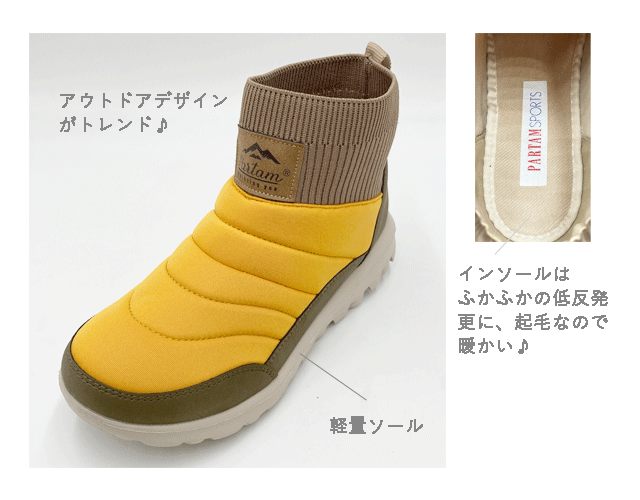 【SALE】PARTAM 軽量 ふわふわ 起毛 低反発 カップイン インソール 履き口 ニット キルティング コンビ バイカラー ショート ブーツ 暖かい 脱ぎ履き 楽ちん アウトドア IC25750 ブラック グレー オーク マスタード 22.5 23.0 23.5 24.0 24.5