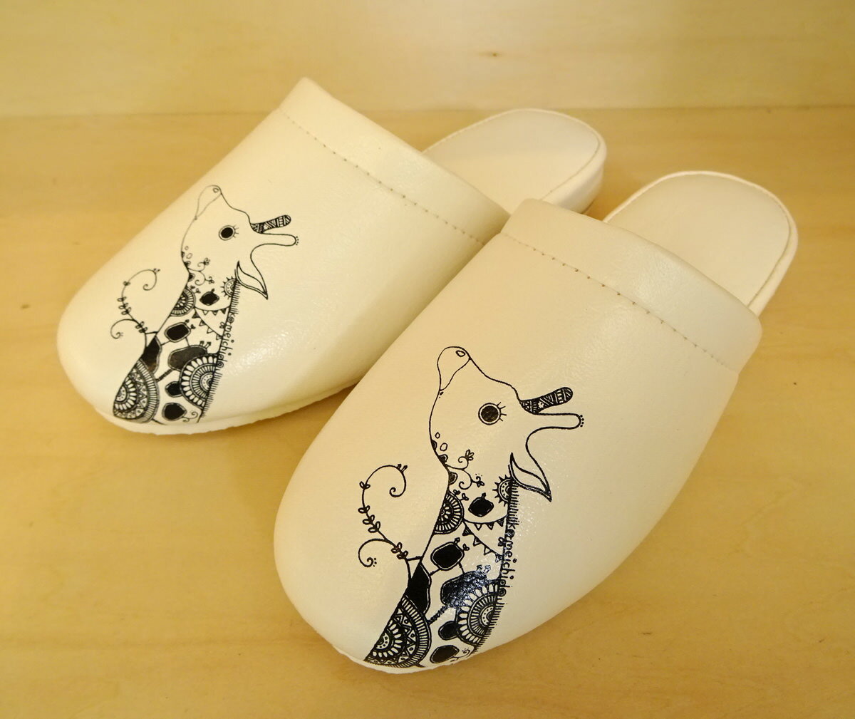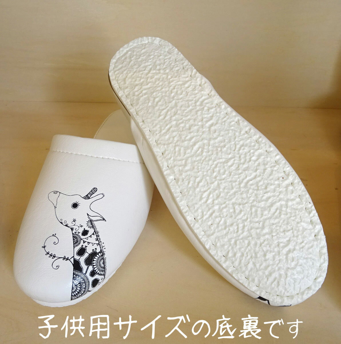 商品詳細 特徴 当店のオリジナル商品、繊細なキリンのイラストをシルク印刷したオフホワイトビニール子供サイズスリッパです。